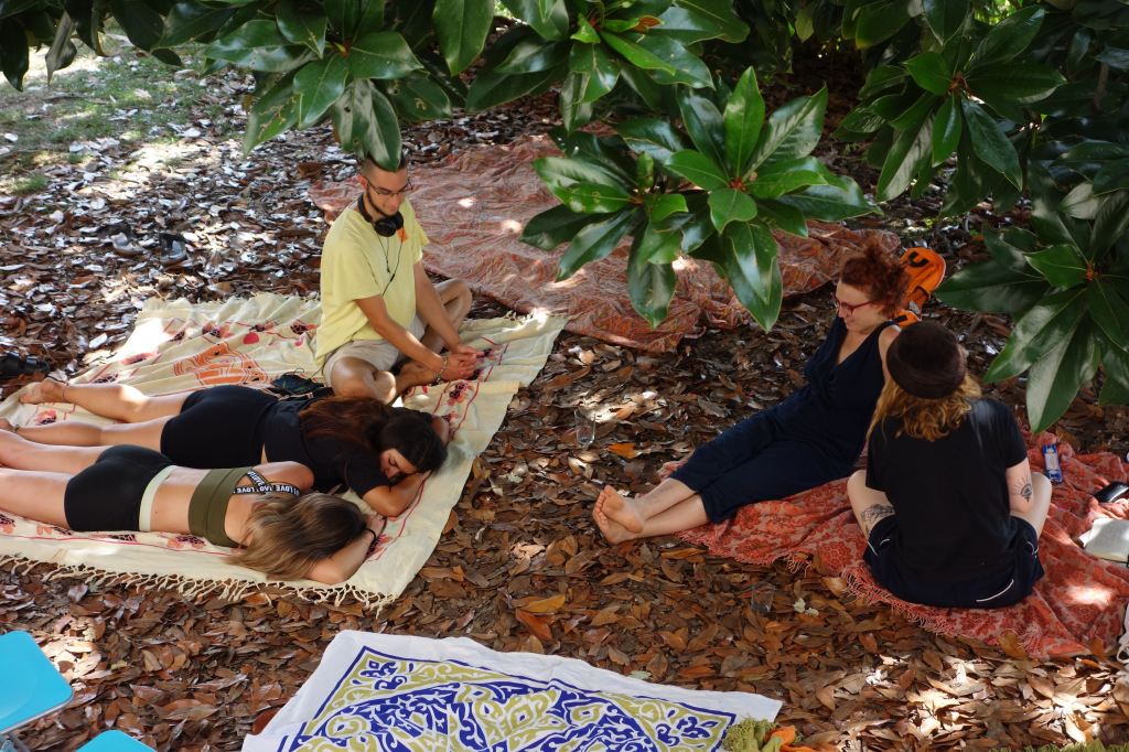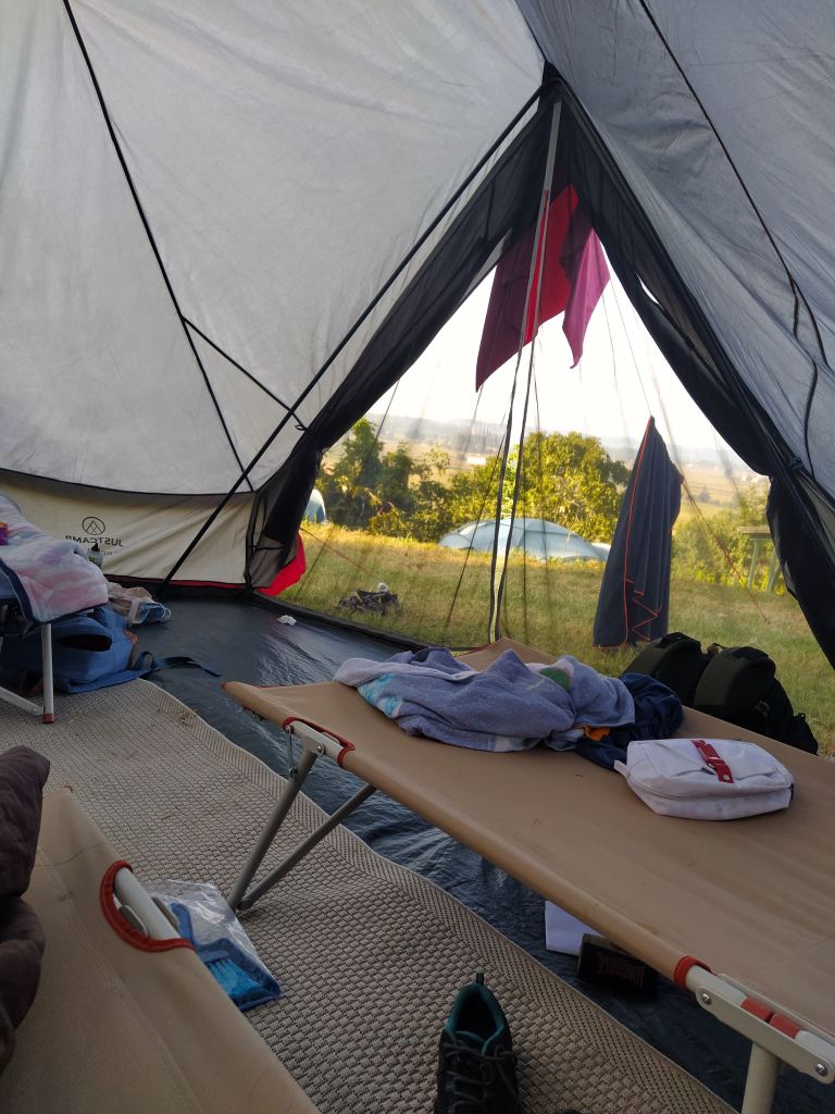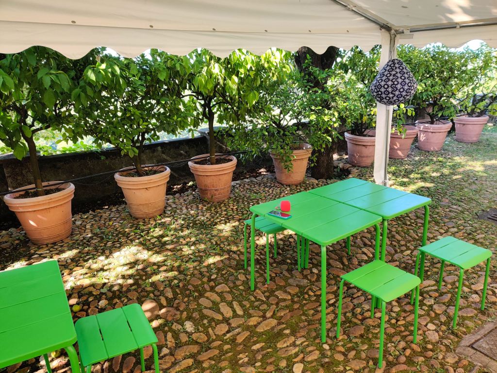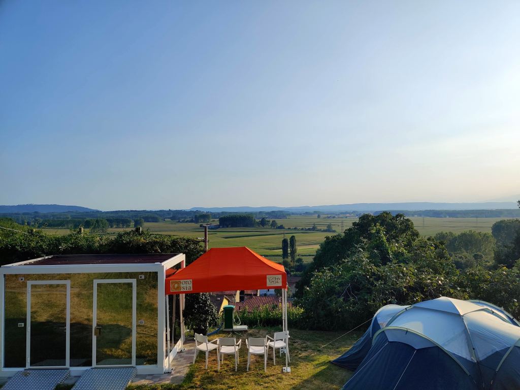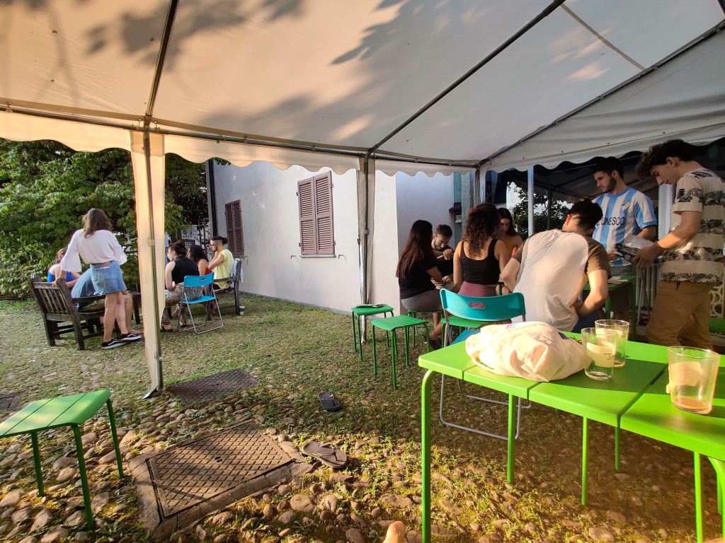 Per l’accoglienza il prato è stato allestito con tende, bagni innovativi prefabbricati per esterni e alcuni spazi ricreativi per la cucina di casa Magnolia.
