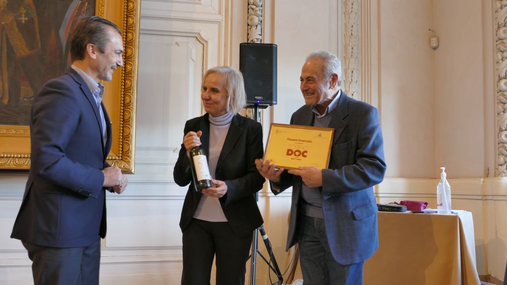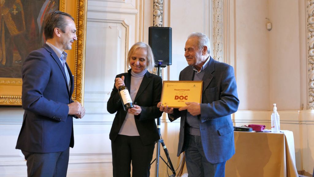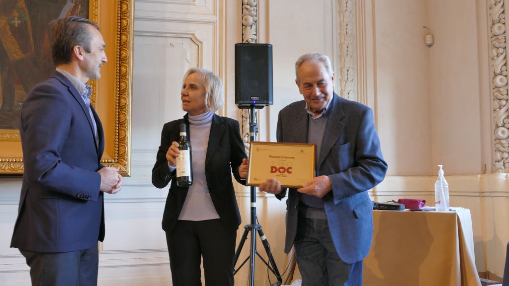 Emanuela Piovano, viticultora in Bollengo del vino biologico OROSIA che ha scelto una coltivazione, tutta ecosostenibile sulla via Francigena, riceve il PREMIO dal presidente della Camera di Commercio di Torino, dott. Dario Gallina, alla presenza di Sergio Arnoldi, Camera di Commercio di Torino, del presidente dell’Enoteca Regionale dei Vini della Provincia di Torino, Corrado Scapino e il giornalista Alessandro Felis.